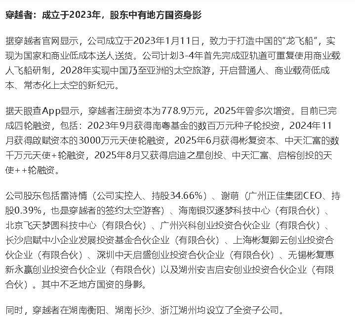 問題是,穿越者公司到底有些什么技術(shù)和知識(shí)積累呢?龐大的資金又從何而來?這一行業(yè),普通人想要了解的門檻比較高,說白了就是不懂,只能從側(cè)面來分析其可行性。比如,注冊(cè)資金幾百萬的公司,怎么能完成這么宏大的任務(wù)?2023年成立的公司,2028年就能把太空船送上天?這需要穿越者拿出真實(shí)的成果和現(xiàn)實(shí)的路徑,給出令人信服的答案。